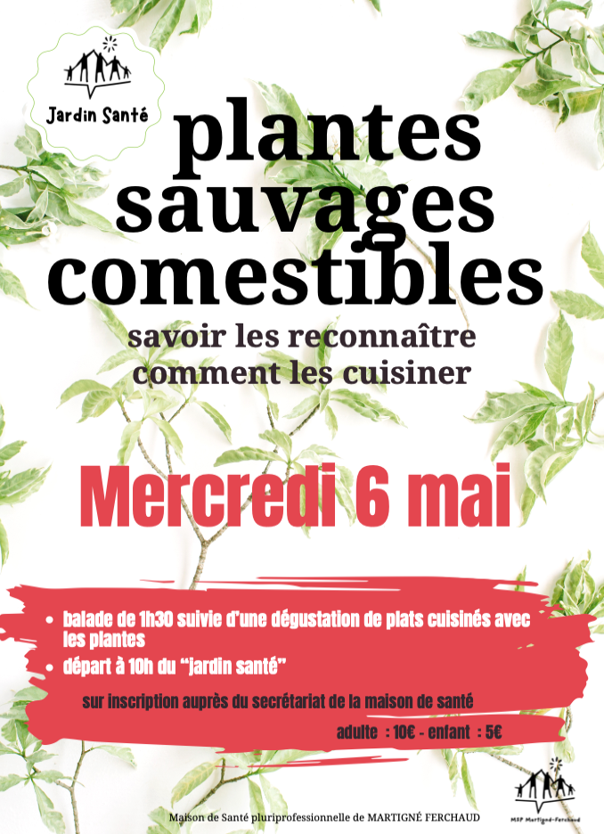 Si vous êtes intéressés, rejoignez nous le mercredi 6 mai à 10h à la maison de santé de Martigné Ferchaud pour une balade de 1h30 avec une animatrice, suivie d'une dégustation de plats cuisinés avec les plantes.